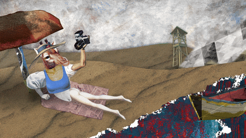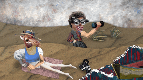 On a sunny beach, a man drives a grotesquely loud car while pumping iron. Spotting a woman taking selfies, he leaps out in a theatrical display of strength to win her notice.
