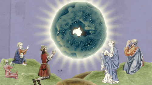 A surreal animated short in which a man exits a church and blows a horn, sending a series of strange projectiles into another man’s mouth. The man’s head then opens to reveal a massive blue “holy” donut, which becomes the object of reverent worship.